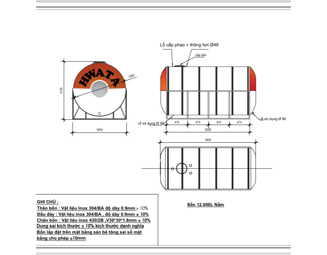 3.Thông số kỹ thuật của bồn inox Hwata 12000 lít Ngang