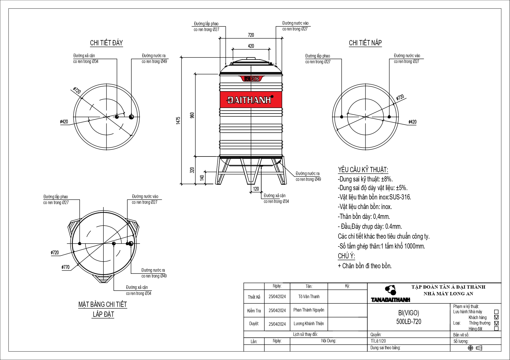 Bản vẽ bồn nước inox Đại Thành VIGO 500 lít đứng