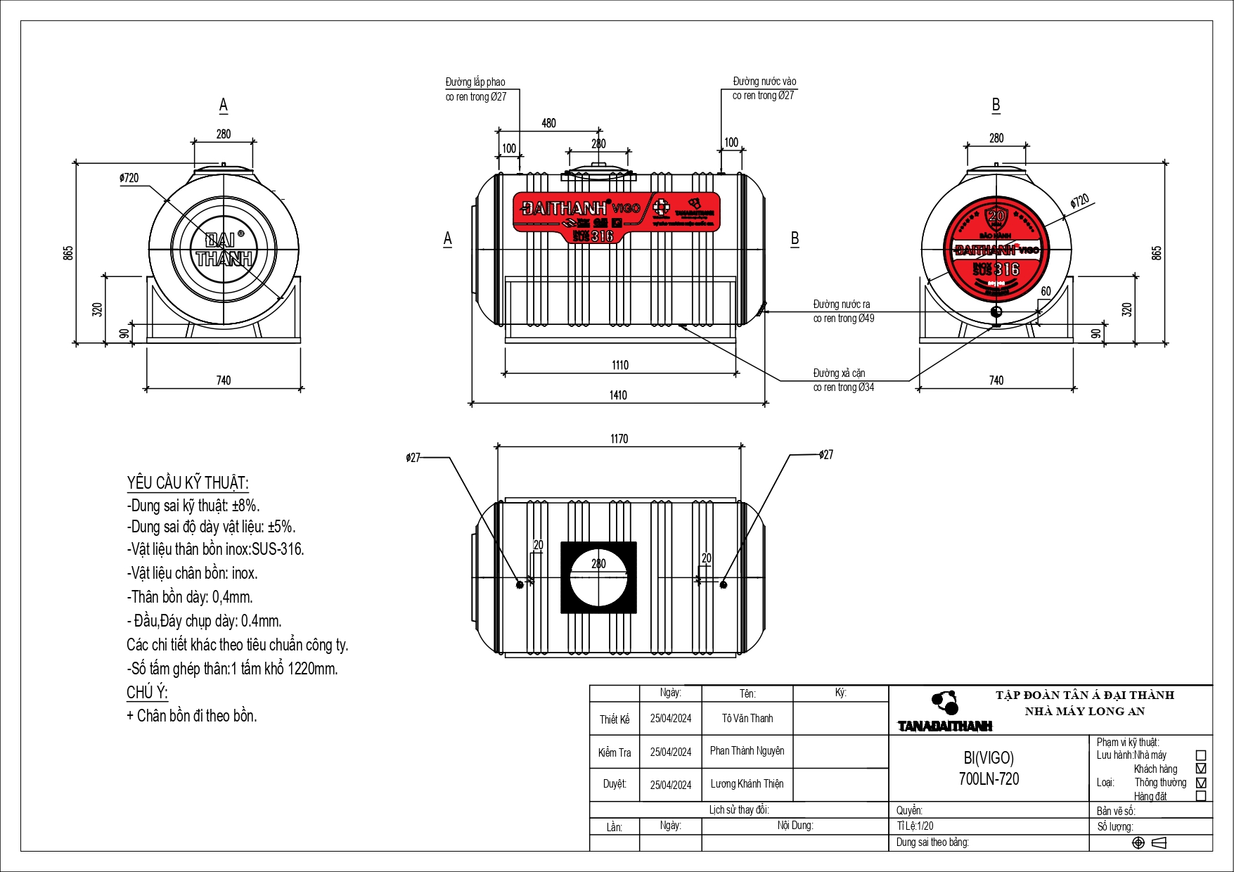 Bản vẽ bồn nước inox Đại Thành VIGO 700 lít ngang