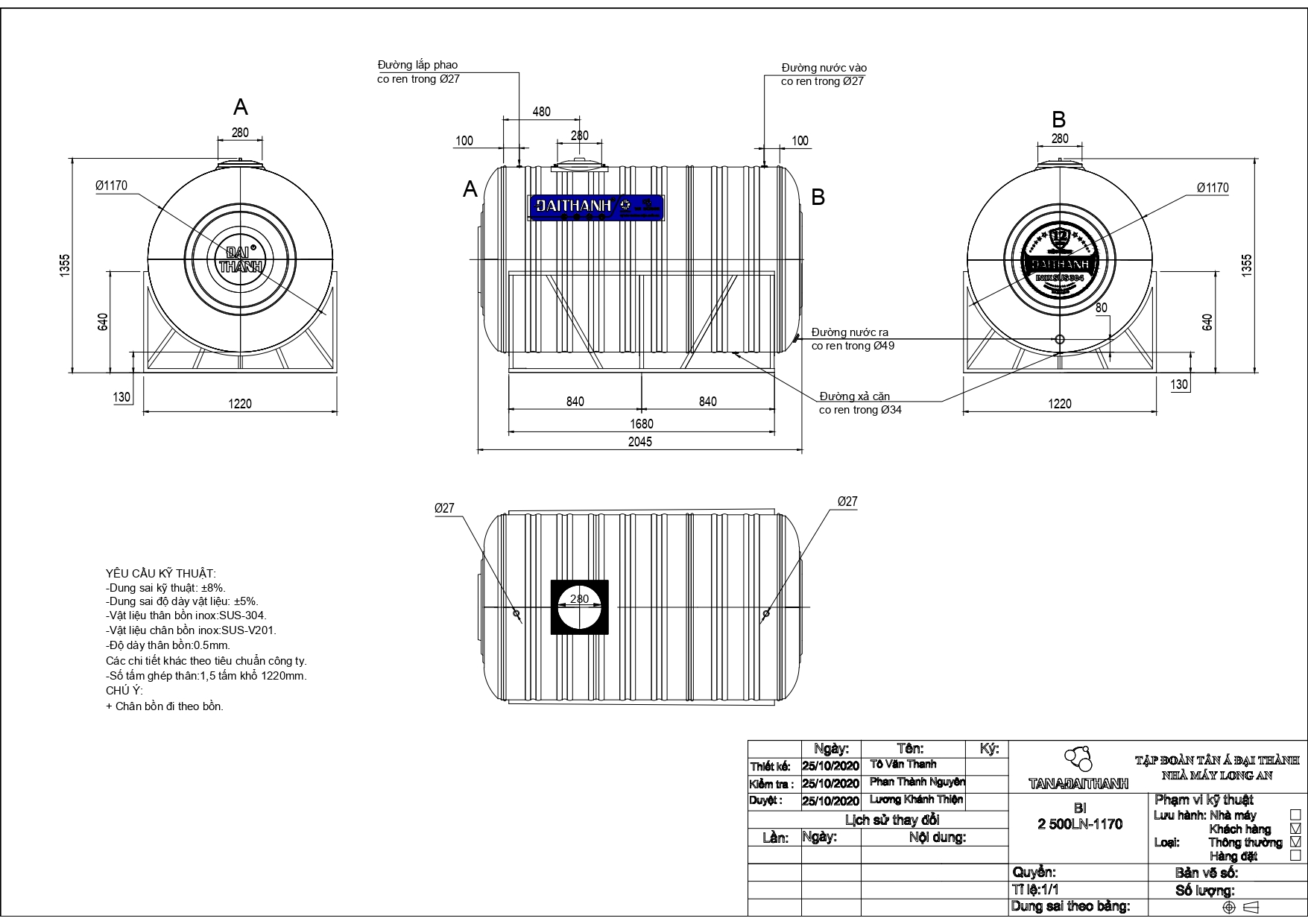 Tiêu chuẩn kỹ thuật của bồn nước inox 2500L Đại Thành nằm