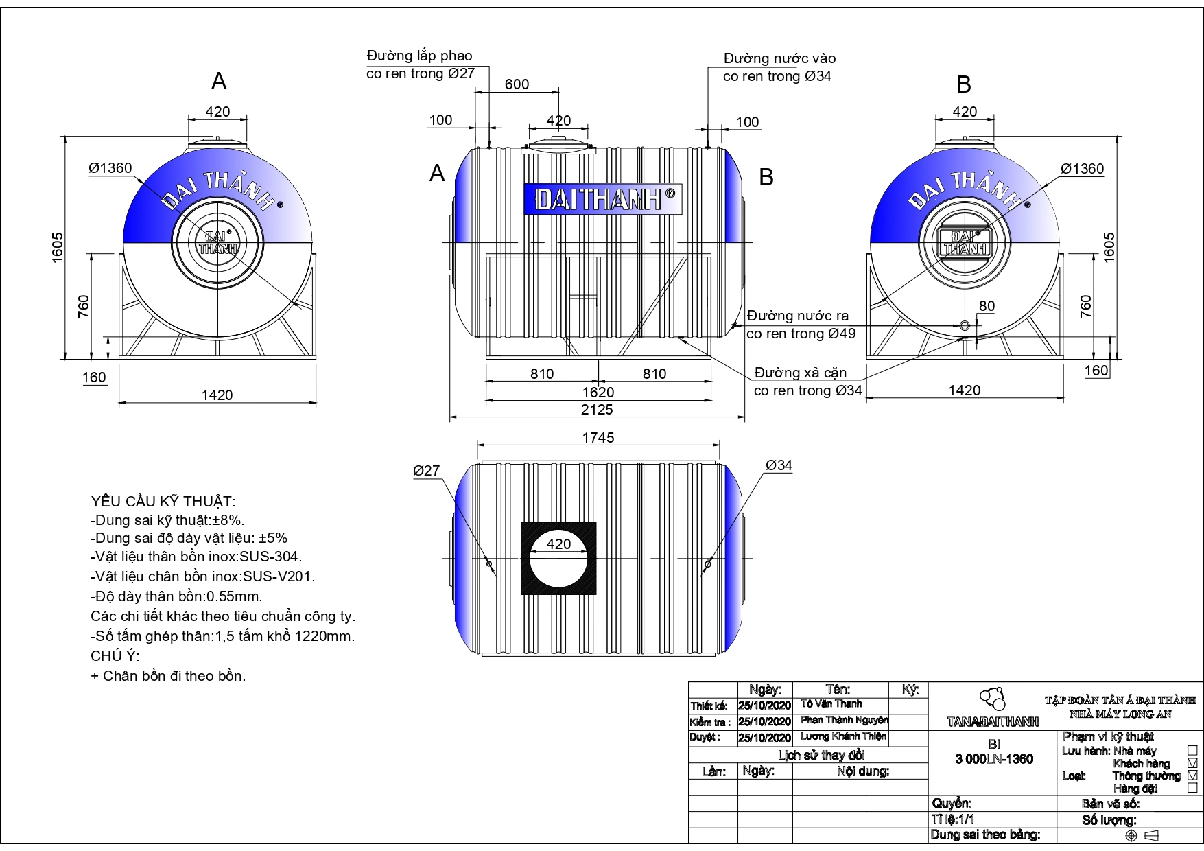 3. Tiêu chuẩn kỹ thuật của bồn nước inox Đại Thành 3000L ngang