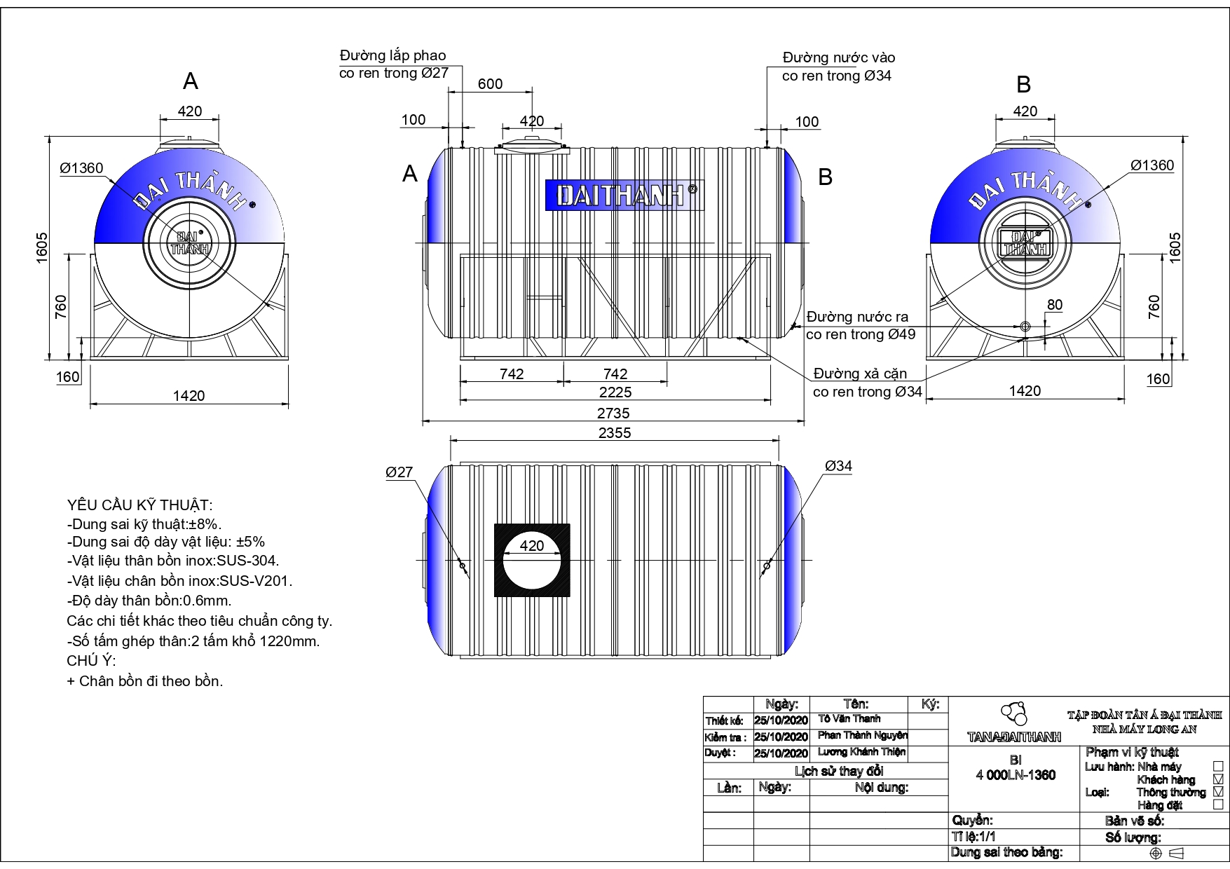 Bản vẽ bồn nước inox Đại Thành 4000 lít ngang