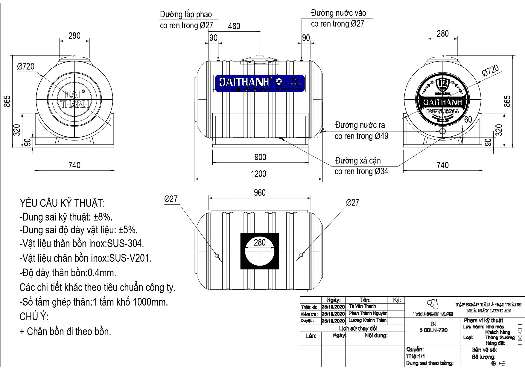 Bản vẽ bồn nước inox Đại Thành 500 lít ngang