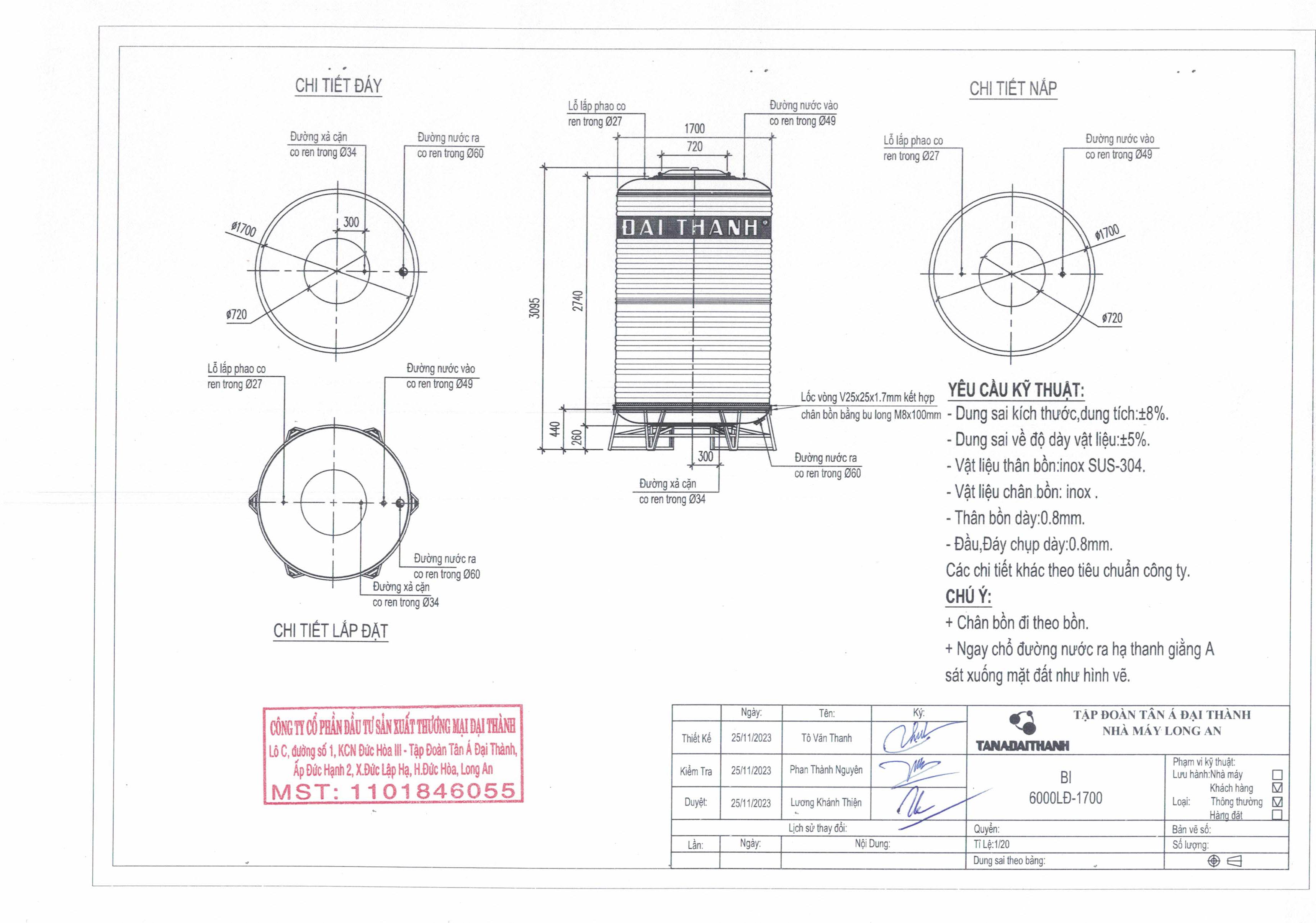 Bản vẽ bồn nước inox Đại Thành 6000 lít đứng