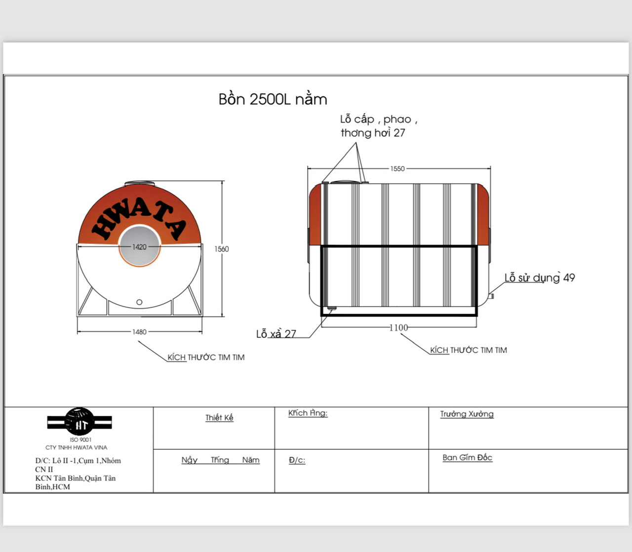| Bồn 2.500 L nằm | 1.420 | 1.560 | 1.550 |