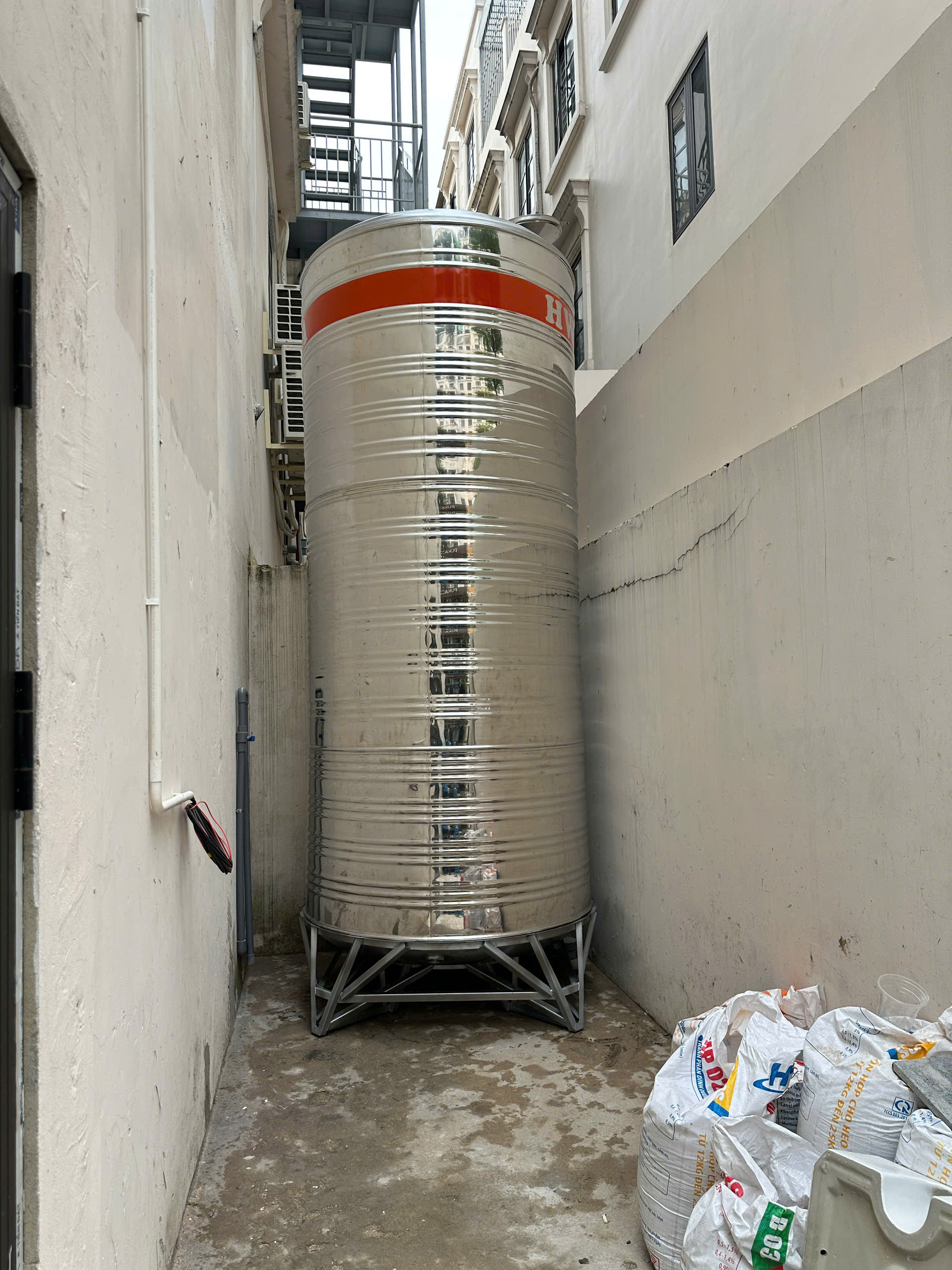 Nhà 4 tầng khá cao nên Quý khách hàng nên sử dụng bồn nước nằm/bồn ngang tốt hơn cả (trong điều kiện có diện tích sân thượng rộng rãi). Bởi bồn ít bị ảnh hưởng bởi gió bão và các bồn inox nằm/ngang luôn dàn đều phần áp lực nên mặt trần, mặt sàn, vững chãi hơn.