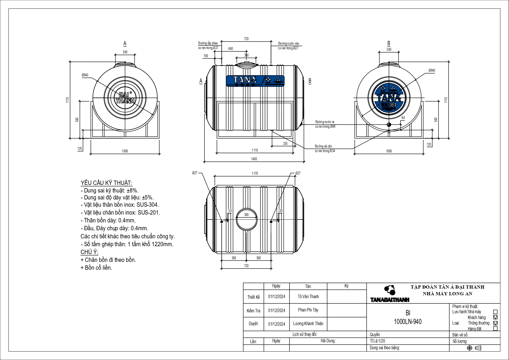 Bản vẽ bồn nước inox Tân Á 1000L ngang