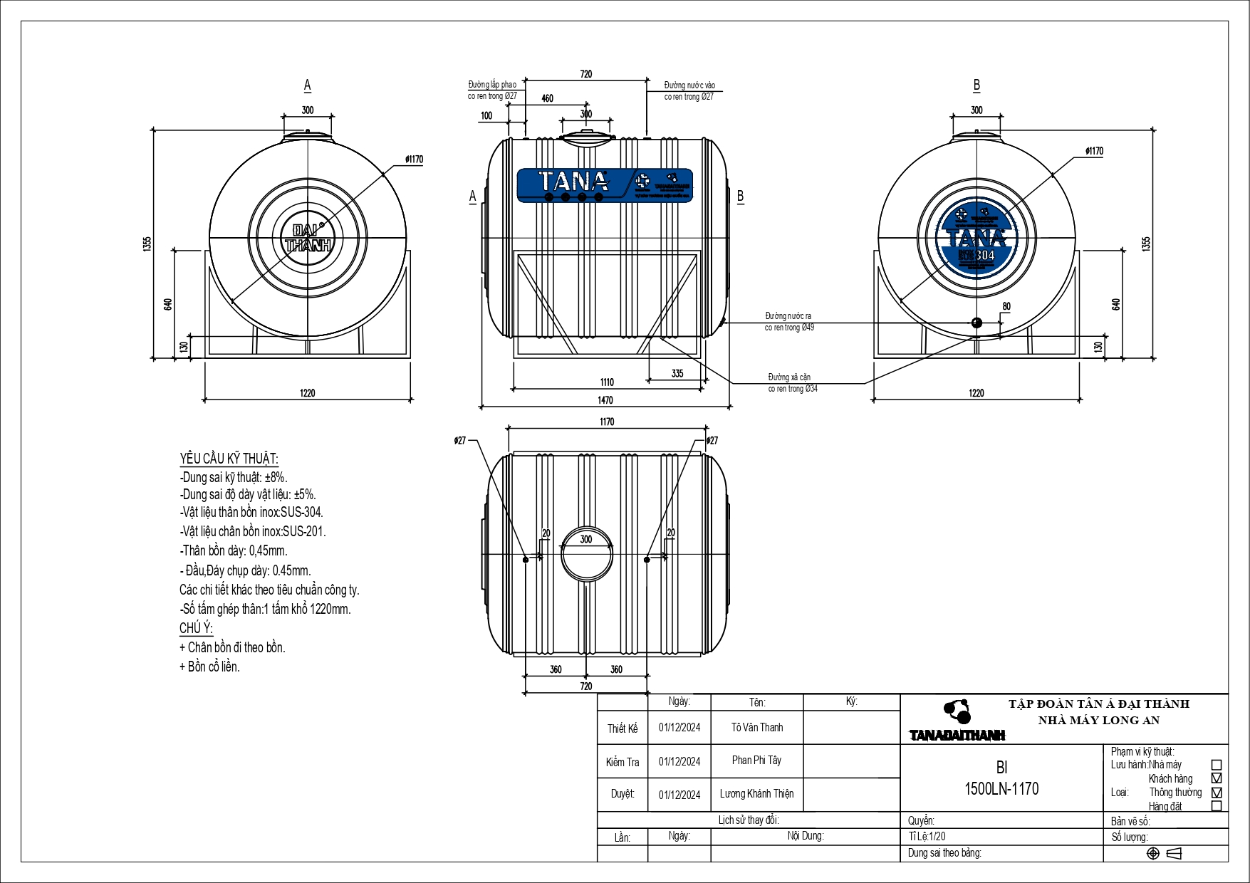 Bản vẽ bồn nước inox Tân Á 1500L ngang