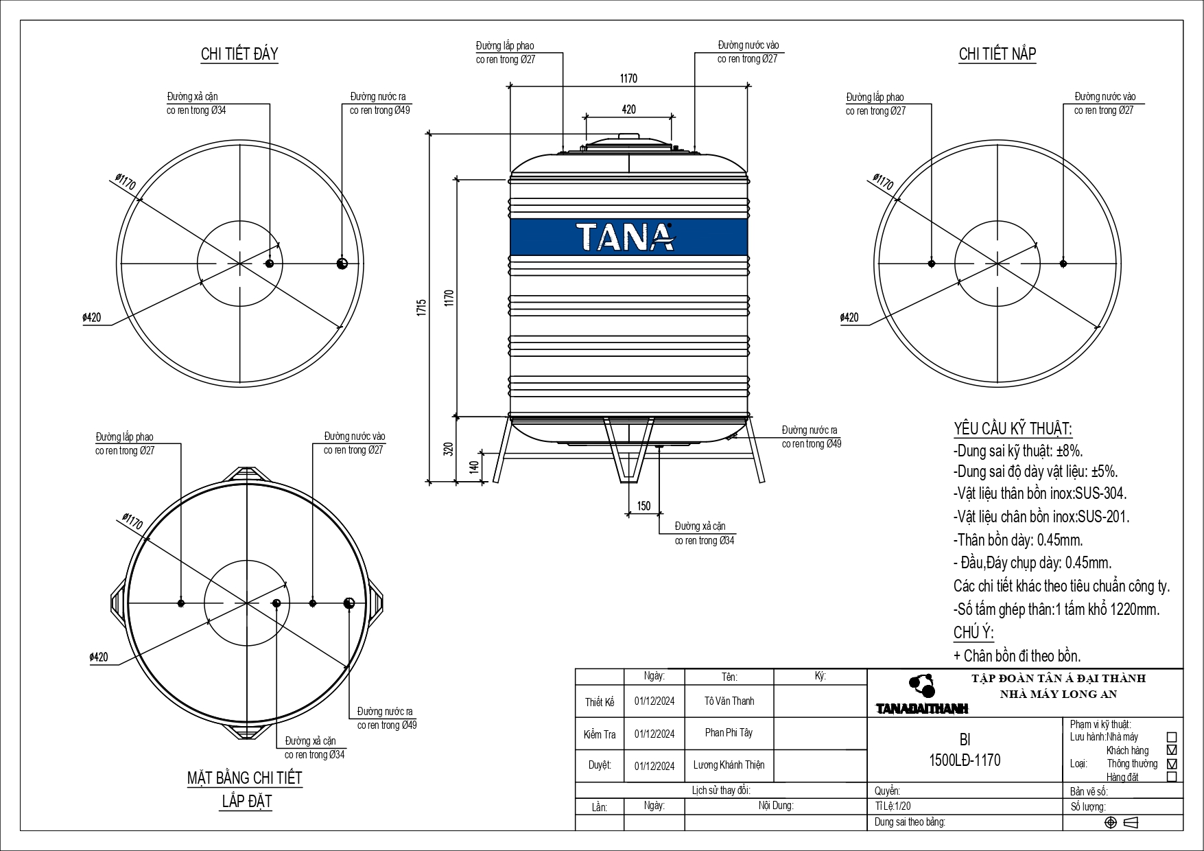 Bản vẽ bồn nước inox Tân Á 1500 lít đứng