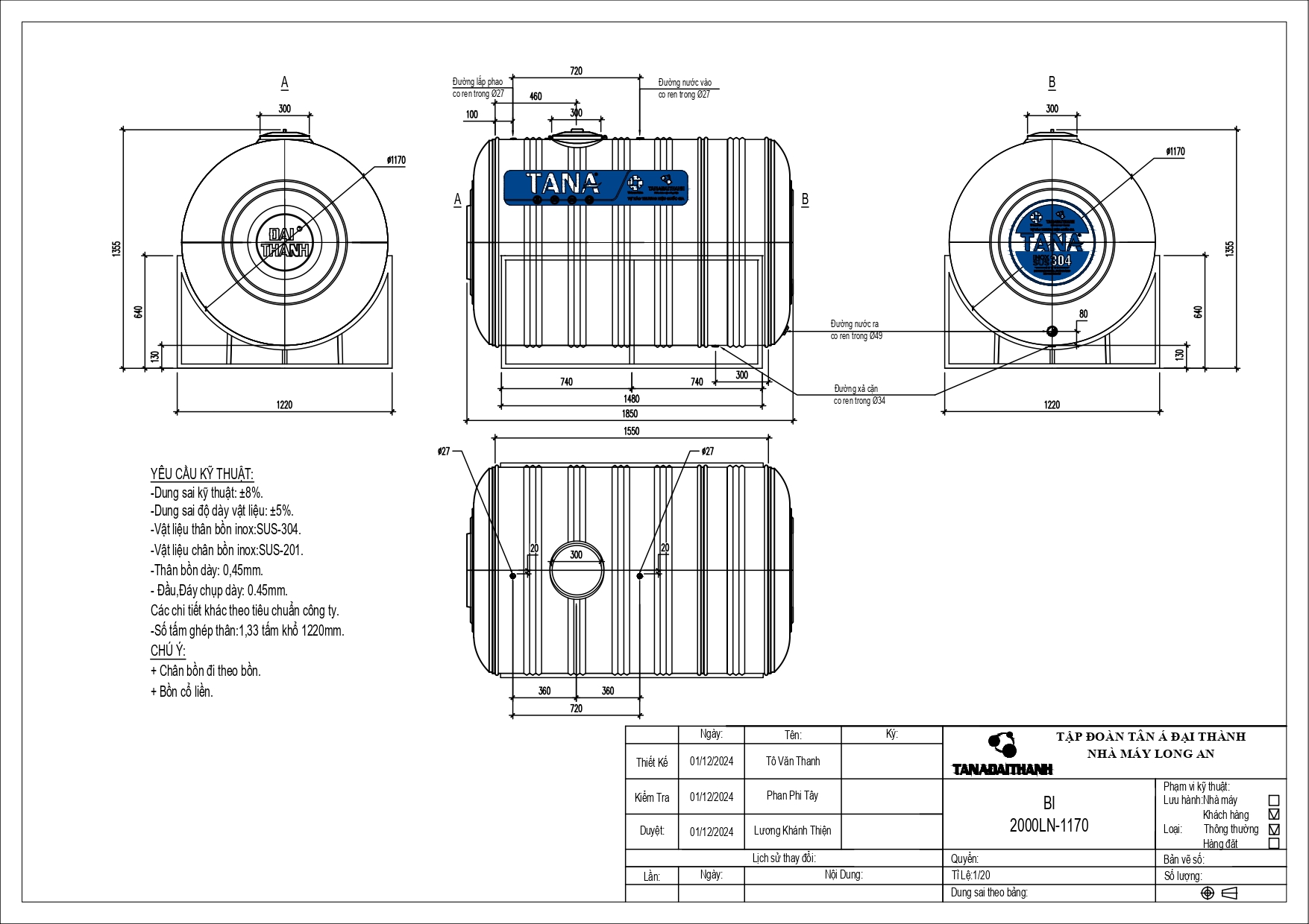 Bản vẽ bồn nước inox Tân Á 2000L ngang