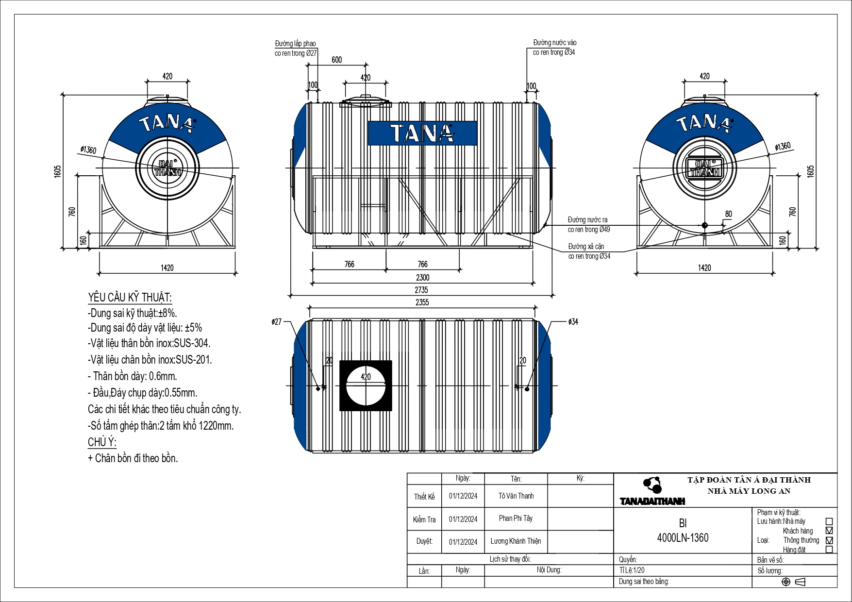 Bản vẽ bồn nước inox Tân Á 4000L ngang