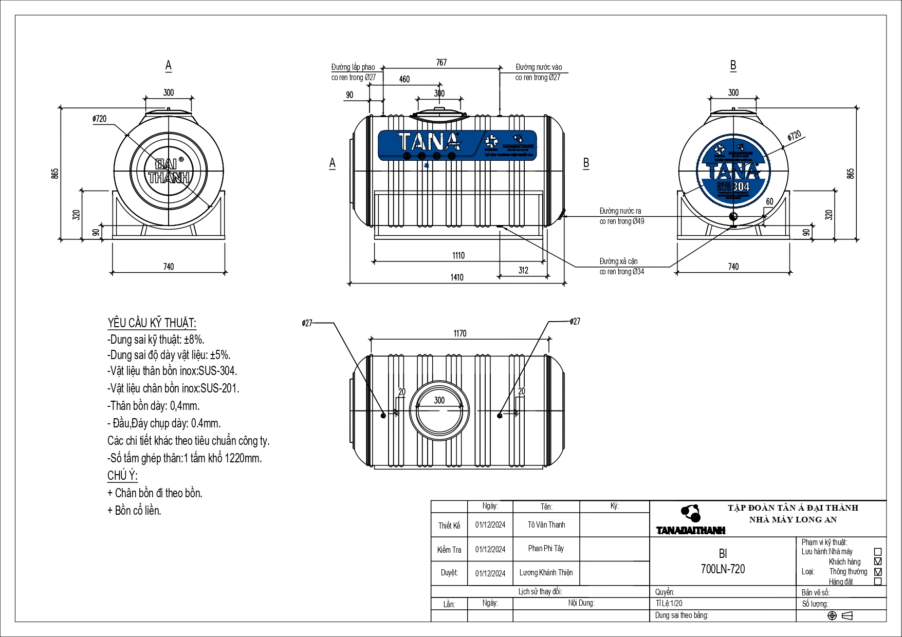 Bản vẽ bồn nước inox Tân Á 700L ngang