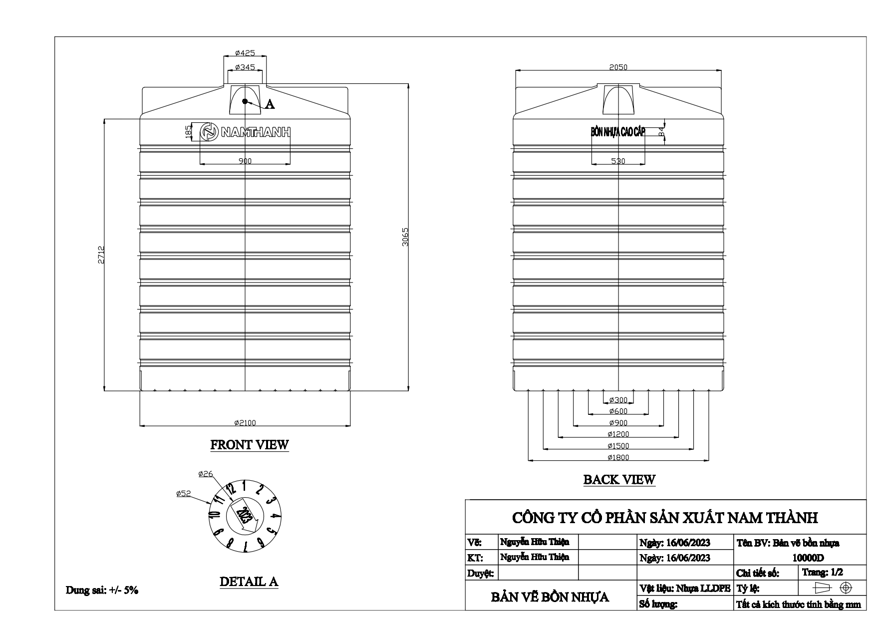 Bản vẽ bồn nước nhựa Nam Thành 10000L đứng