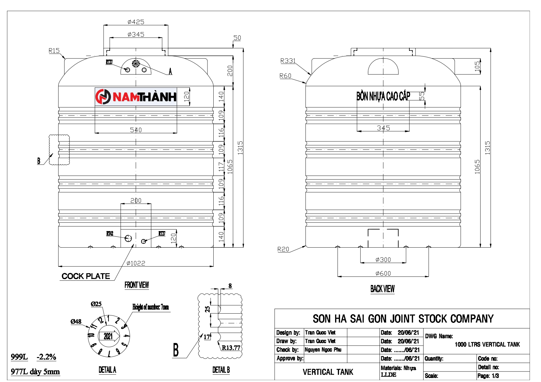 Bản vẽ bồn nước nhựa Nam Thành 1000L đứng