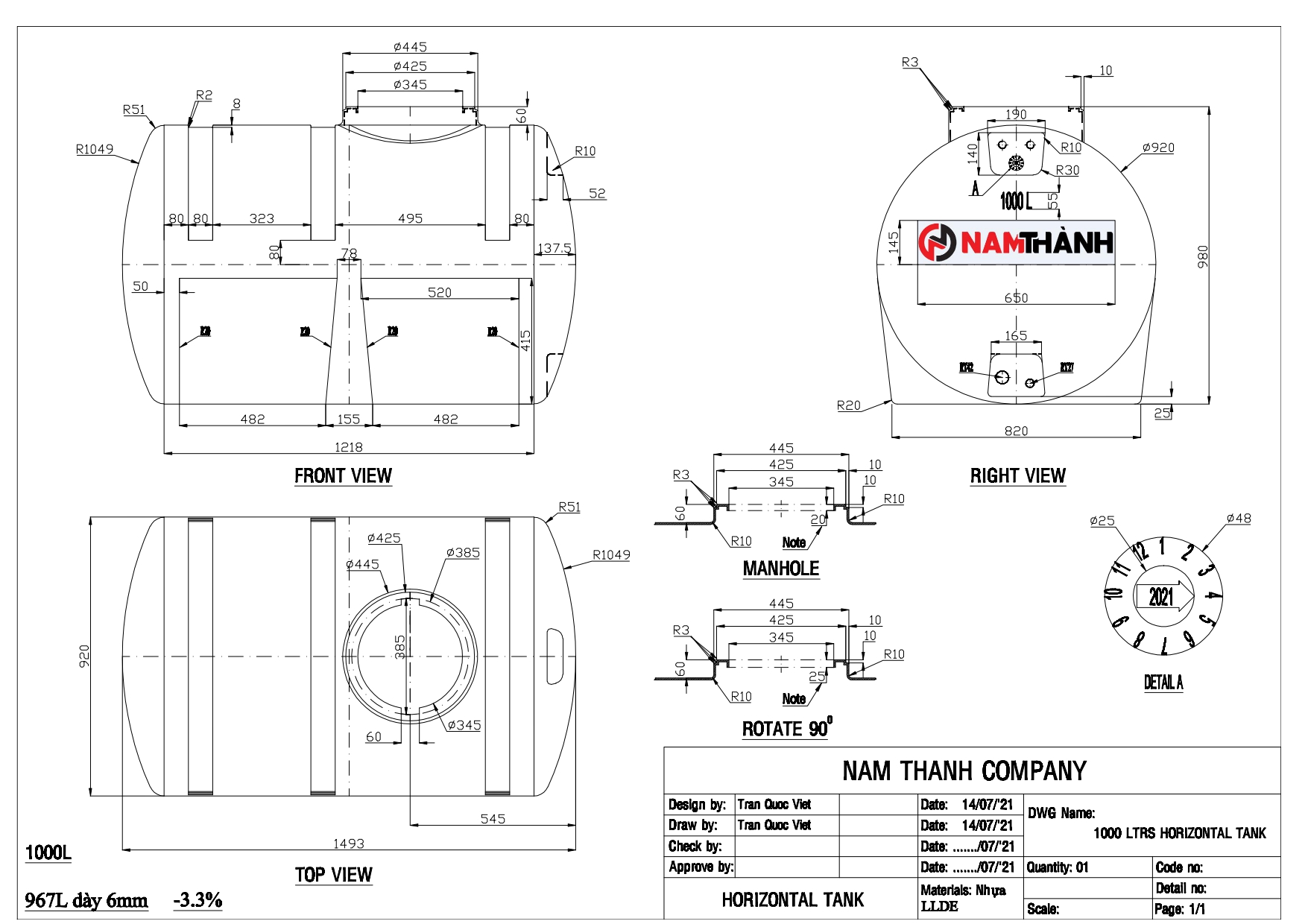 Bản vẽ bồn nước nhựa Nam Thành 1000L ngang