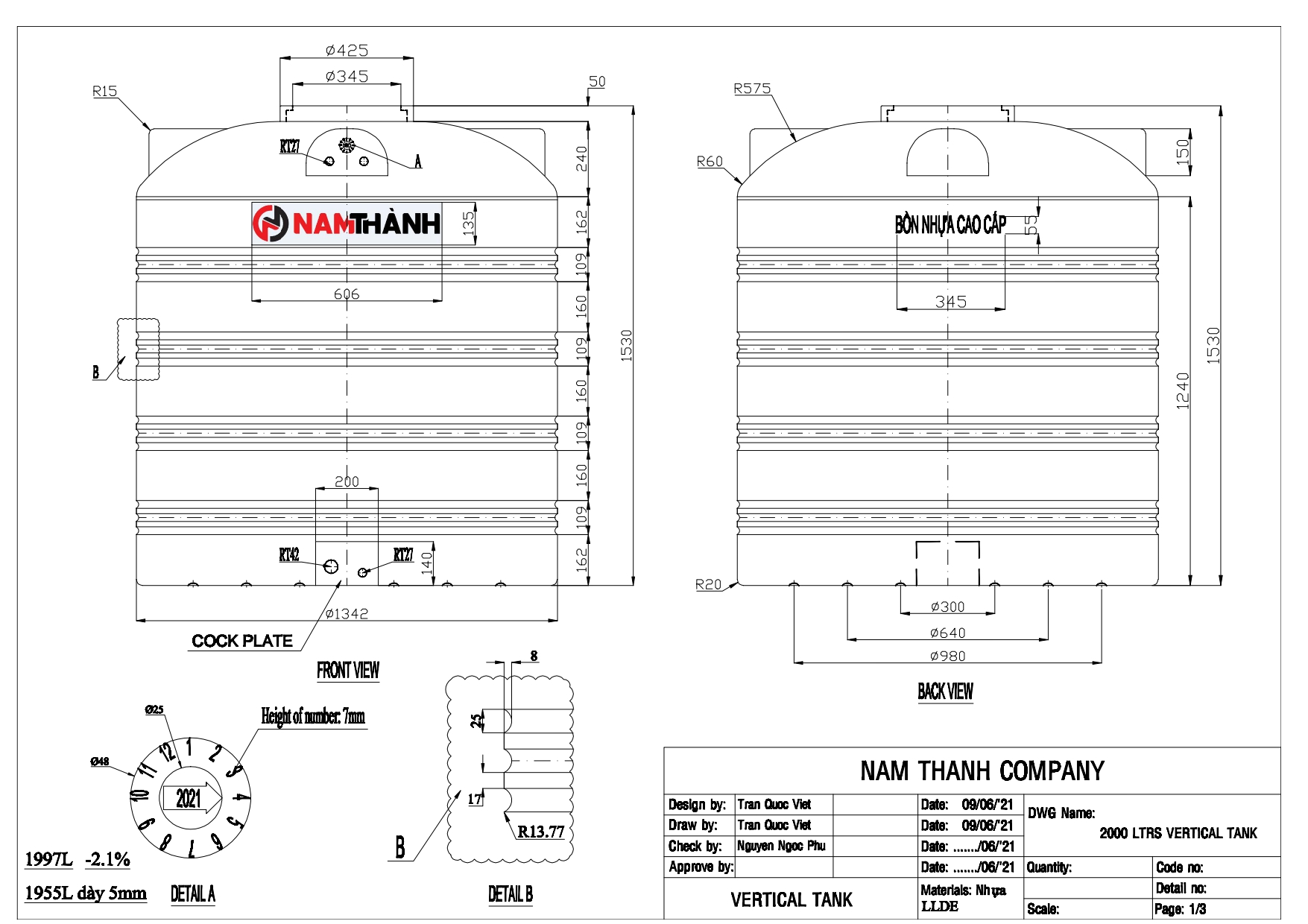 Bản vẽ bồn nước nhựa Nam Thành 2000L đứng