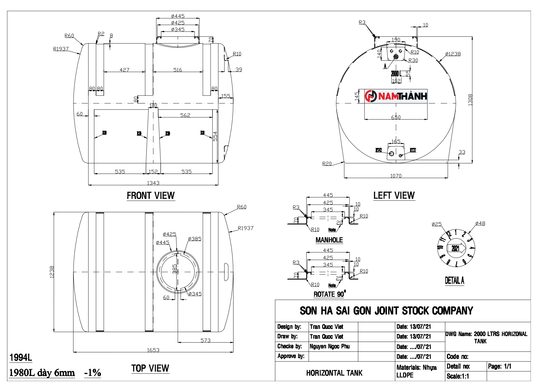 Bản vẽ bồn nước nhựa Nam Thành 2000L ngang