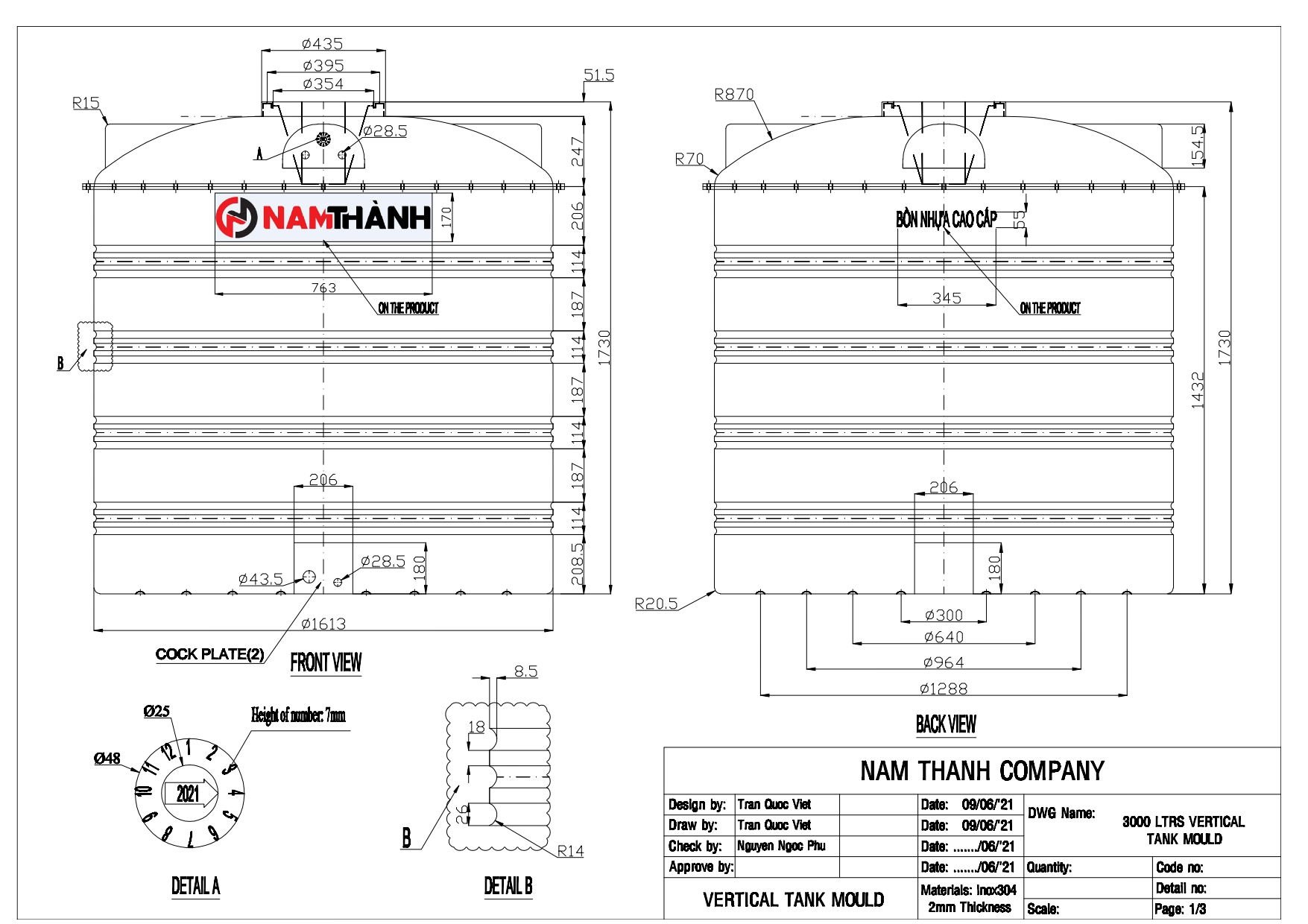 Bản vẽ bồn nước nhựa Nam Thành 3000L đứng