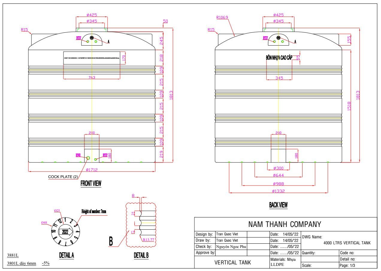 Bản vẽ bồn nước nhựa Nam Thành 4000L đứng