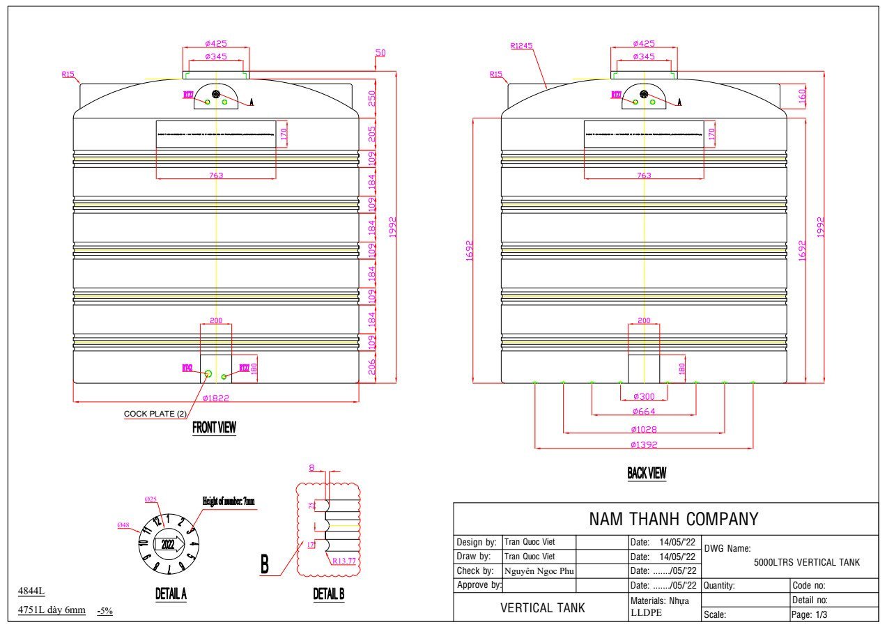 Bản vẽ bồn nước nhựa Nam Thành 5000L đứng