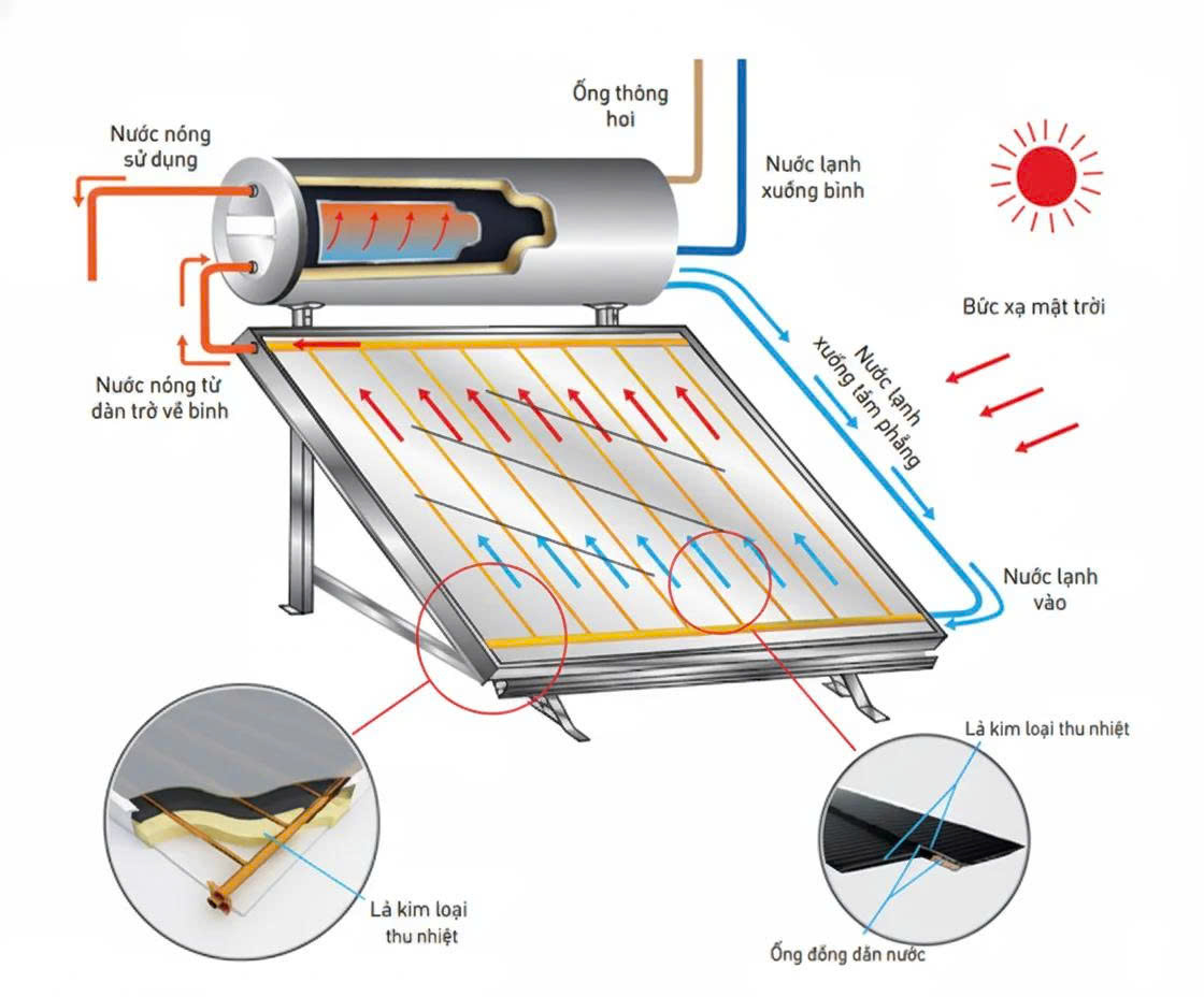 Hệ thống máy nước nóng năng lượng mặt trời thái dương năng tấm phẳng Flat Gold hoạt động theo nguyên lý đối lưu nhiệt tự nhiên, tận dụng khả năng hấp thụ cao năng lượng mặt trời thông qua lớp kính cường lực có kết cấu dạng thấu kính tăng hiệu suất hấp thu nhiệt. Lớp bảo ôn phía dưới làm tăng hiệu quả làm nóng nước. Năng lượng mặt trời được hấp thụ tại bề mặt thiết bị sẽ đun nóng nước, do quá trình đối lưu nhiệt, nước tại bình bảo ôn sẽ tăng lên, quá trình này diễn ra liên tục cho đến khi nhiệt độ trong bình bằng nhiệt độ của nước tại thiết bị hấp thụ.